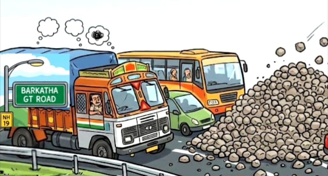 बरकट्ठा में अवैध पत्थर लदा हाइवा का तांडव, पुलिस पीछा देख जीटी रोड पर बोल्डर गिराकर फरार